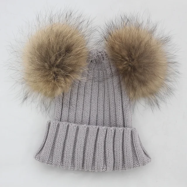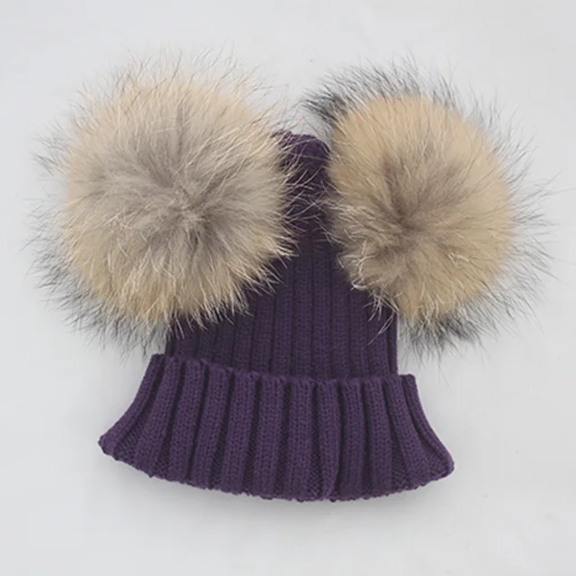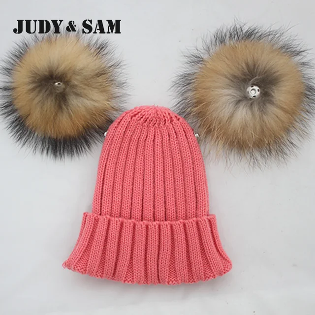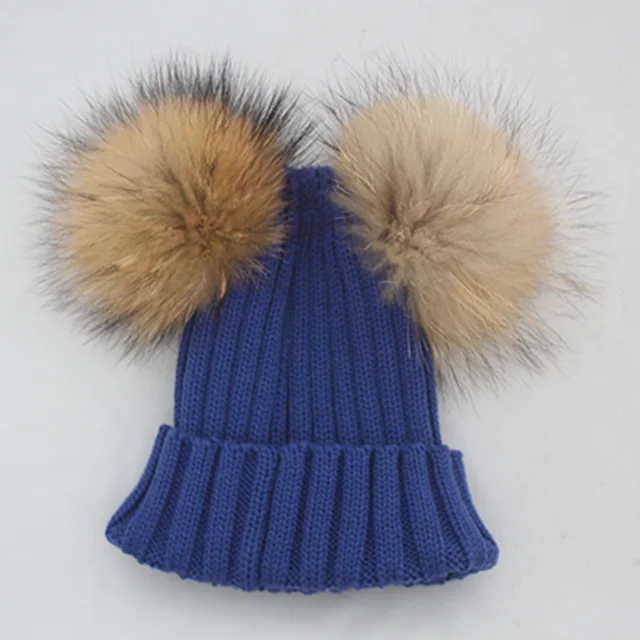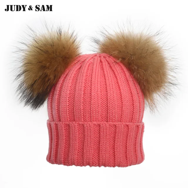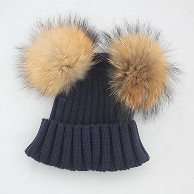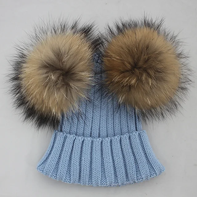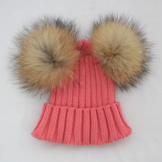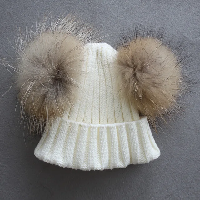 | [해외]더블 응원 여성 겨울 모자 혼방 모직 니트 gorros 캡 천연 컬러 너구리 모피 자란 |