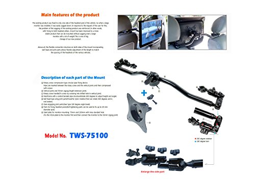 -. Binding : Electronics -. Brand : Top Mount -. Feature : 1. Compared to the method of fixing one headrest post, even a heavy monitors are well fitted without deflection by both headrest poles fixing. / 2. Easy mounting method by attaching the VESA standard plate to the monitor first and connecting VESA plate to the joint edge ogf mount frame by gear-interlocking way without any screwing. / 3. Small monitors as well as 27-inch monitors are mountable and Holds up to 10kg in weight. / 4. Flexible angles and length adjustments on both sides of the mount frame make it possible to fix the mount from small cars to even large vans. / 5. Monitor can be rotatable to left and right after mounting. -. Label : ibiz21 -. Manufacturer : ibiz21 -. Model : IK-HDLF-ST75100 -. MPN : IK-TWS2100 -. PackageQuantity : 1 -. PartNumber : IK-TWS2100 -. ProductGroup : Speakers -. ProductTypeName : AV_FURNITURE -. Publisher : ibiz21 -. Studio : ibiz21 -. Title : Bar type monitor mount to fix on both driver's and passenger's seat headrests of vehicle Headrest Mount sturdy aluminum alloy frame with gear-interlocking way VESA standard plate