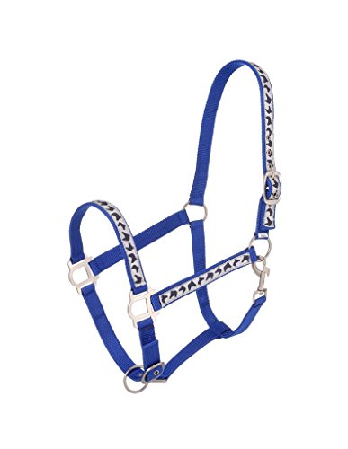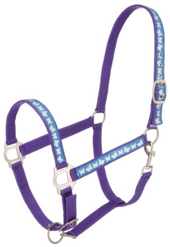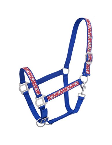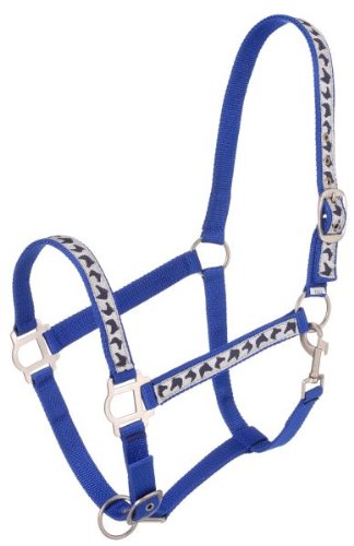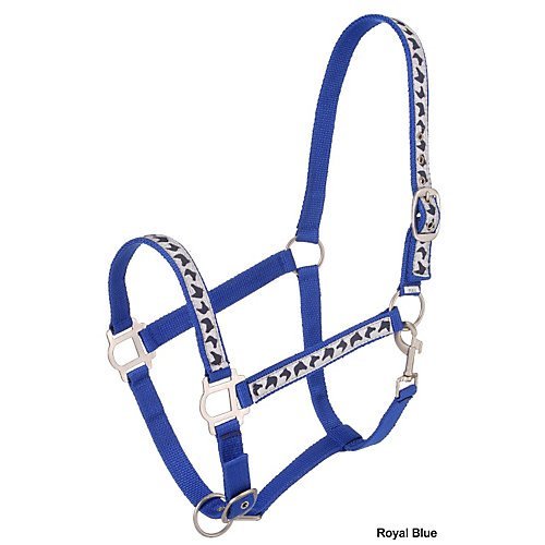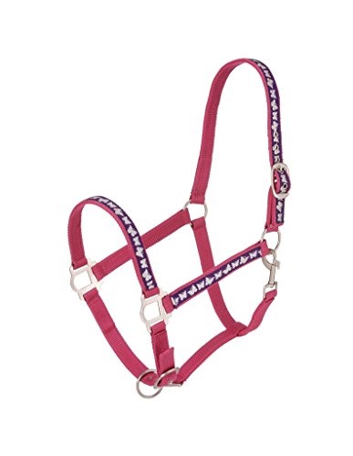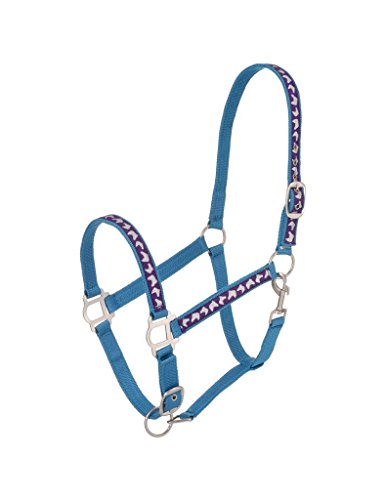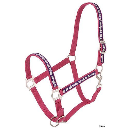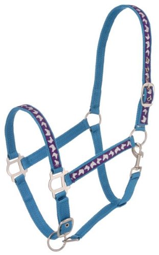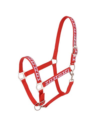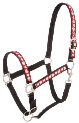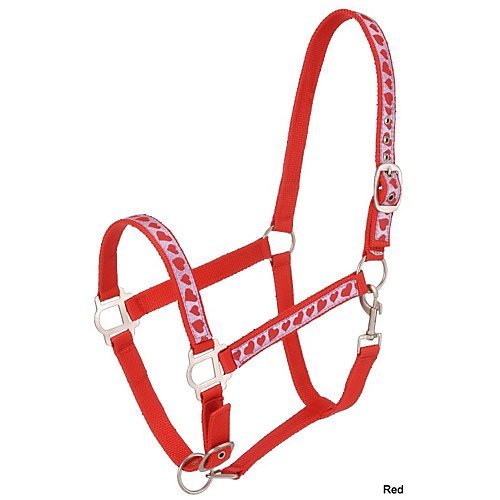 Product DescriptionDouble ply nylon halter with Heart ribbon accents on nose, cheeks and crown. Adjustment at crown and nose. Complete with snap at throat. Satin hardware. Horse Size (800-1100lbs)0
