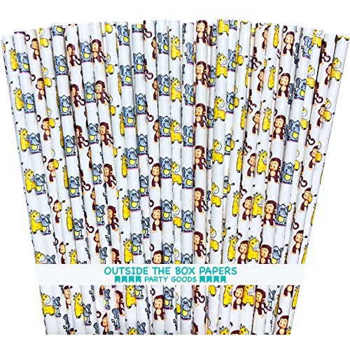 Outside the Box Papers Baby Animal Themed Paper Drinking Straws with Elephants, Giraffes and Monkeys 7.75 Inches Pack of 75 Brown, yellow, blue, white