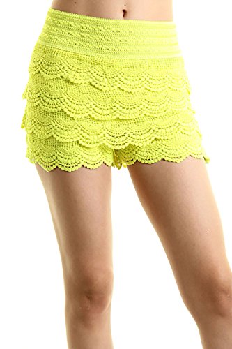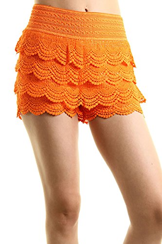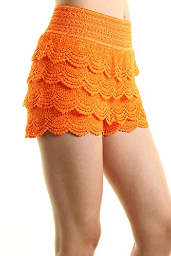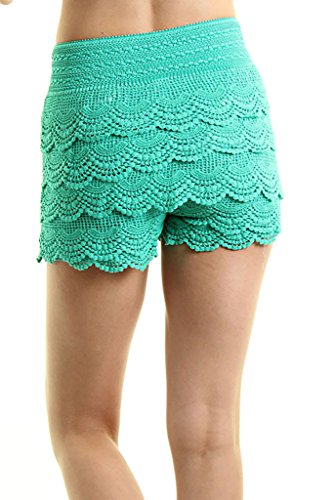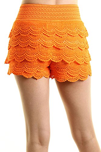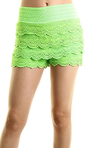 -. Feature : Juniors / Contemporary size which runs one size smaller than the regular women's / Casual Crochet Lace Tiered Scallop Hem Mini Shorts / Mini Shorts with Stretchable Waistband / S/M fits 0-4, M/L fits 6-8, Tight Fitting, Pleated Mini Shorts, Extremely Stretch / *Small / Medium: 11(Waist), 15(Length) *Medium / Large: 12(Waist), 15.5(Length)