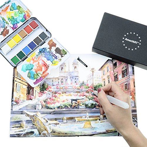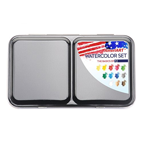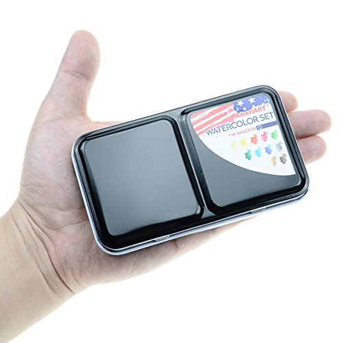 - ✔️CONTENTS -- 12 bright and vibrant half pan watercolor paints, 1 portable and foldable small metal tin case, Palette and mixing trays, 1 FREE refillable waterbrush.