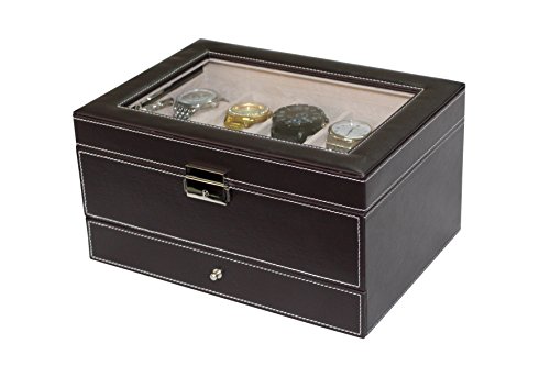 Sodynee Watch Box Large 10 Mens Brown Pu Leather Display Glass Top with Jewelry Box Case Organizer Tray