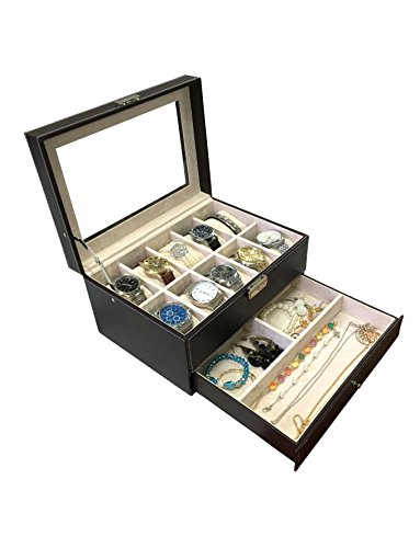 - Brown PU Leather, Glass Top Watch Display Storage Box With Jewelry Box Case Organizer, Two levels, first level includes 12 removable velvet pillows, second level is a jewelry tray.