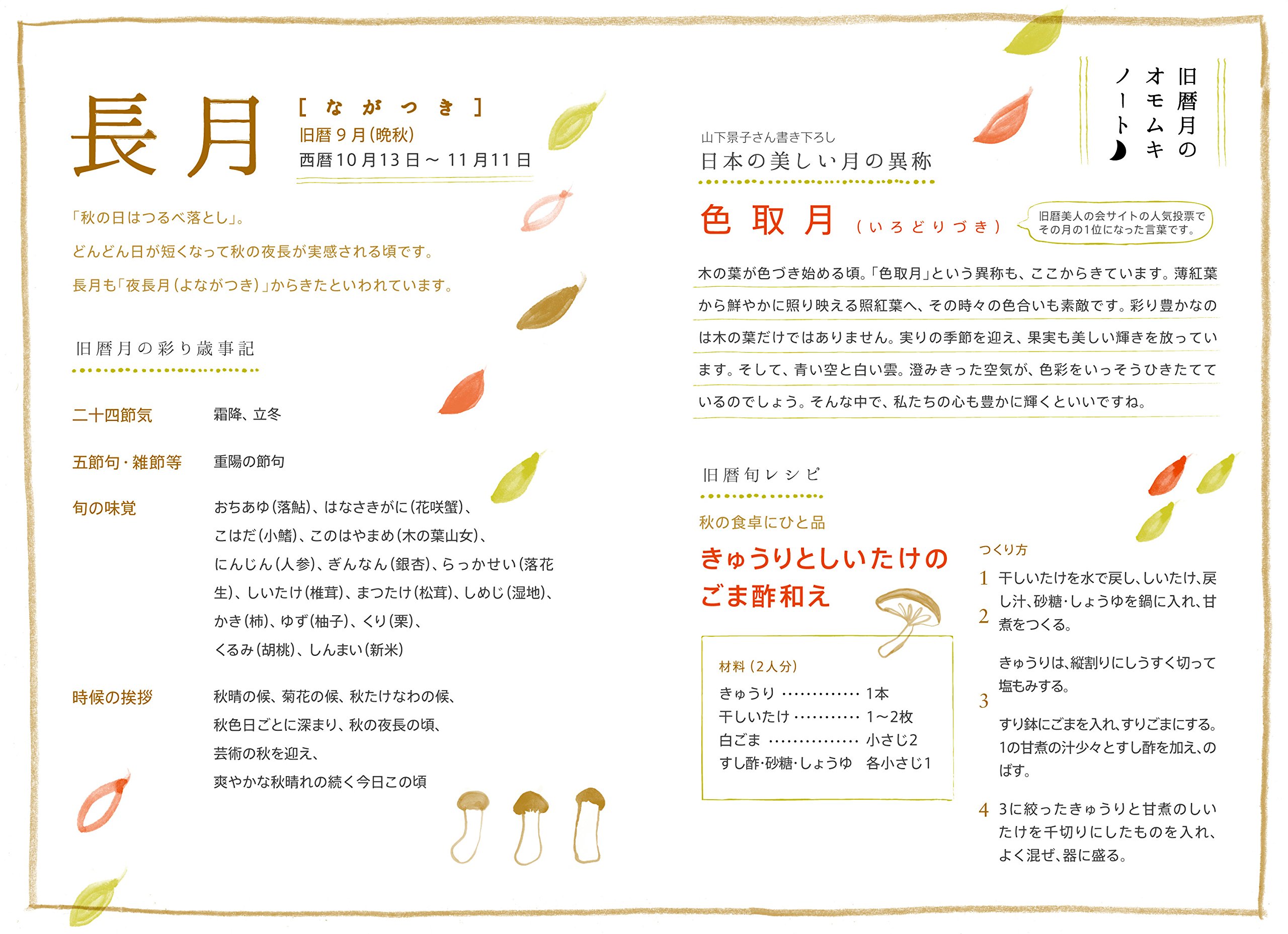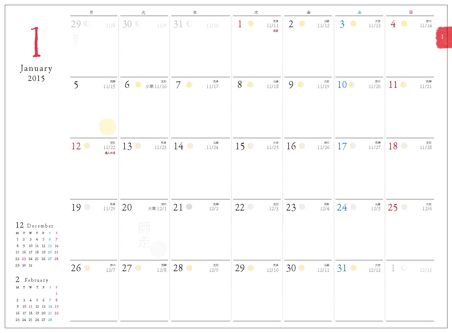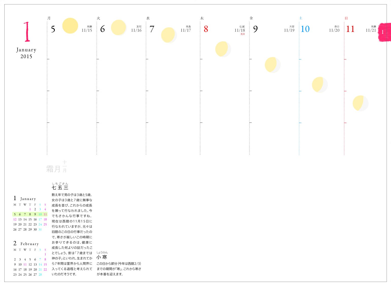 It is a notebook of "separate goods" which can not be compared with others, by adding moon phases, wisdom of the lunar calendar, columns of physical sensation to the functions of the Christian calendar, and users themselves can nurture a "body view".