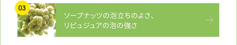 カリ含有石ケン素地、水、パーム脂肪酸、パーム核脂肪酸、グリチルリチン酸2K、サピンヅストリホリアツス果実エキス、ベントナイト、スクワラン、ポリクオタニウム-7、ポリクオタニウム-51、グリセリン、セルロースガム、PPG-20メチルグルコース、塩化Na、グルコン酸Na、EDTA-4Na、エチドロン酸4Na