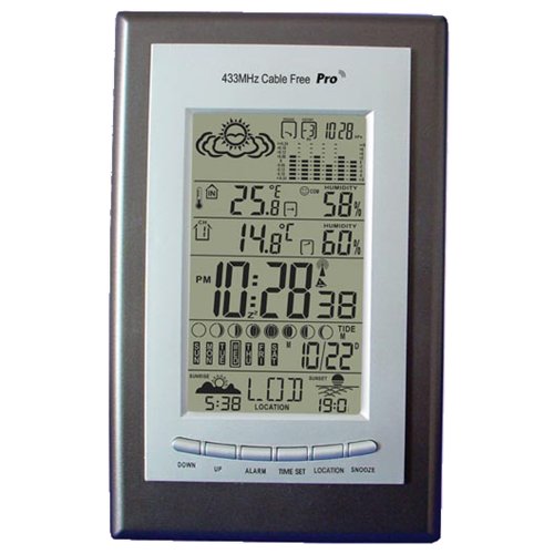 -. Feature : Features dual scale thermometer with indoor/outdoor readings, clock with snooze alarm, calendar with day of week, animation forecast, moon phase, max/min memory, temperature/humidity trend, temperature alert, barometric pressure, sunrise set times, tide indicator with European cities, and comfort index icons / Indoor range: 0/50°C (32/122°F), outdoor range: -20/60°C (-4/140°F) / Includes internal sensor and one remote sensor; can link up to 2 additional remote sensors (item B61500-0800) / Accuracy: 1.5°C; resolution: 0.1 / CE approved and RoHS compliant.