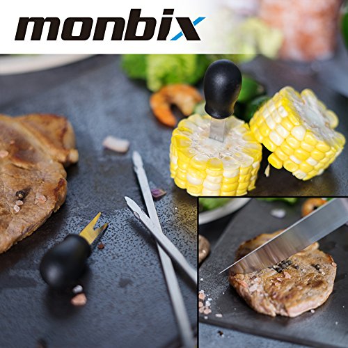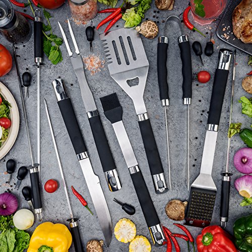 - The Most Complete and Professional Kit - Our BBQ grill set contains almost everything you need for grilling, includes 1 spatula (that has 4 functions), 1 tong, 1 fork, 1 knife, 1 brush, 1 basting brush, 4 skewers, 8 corn holders.