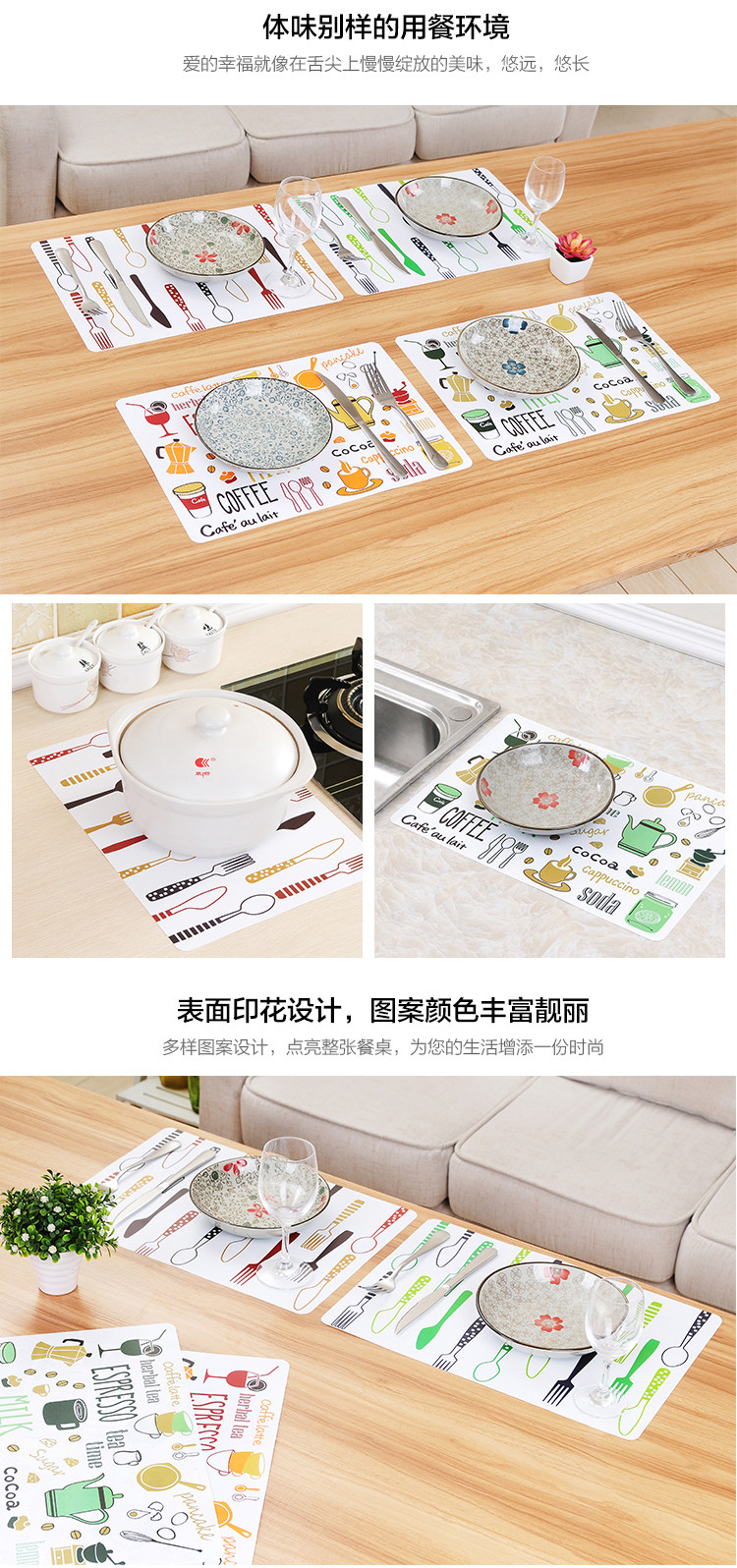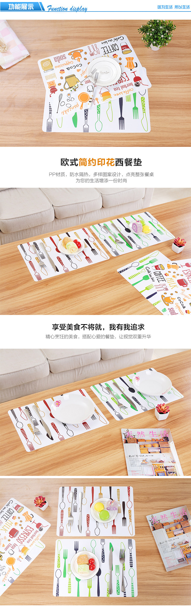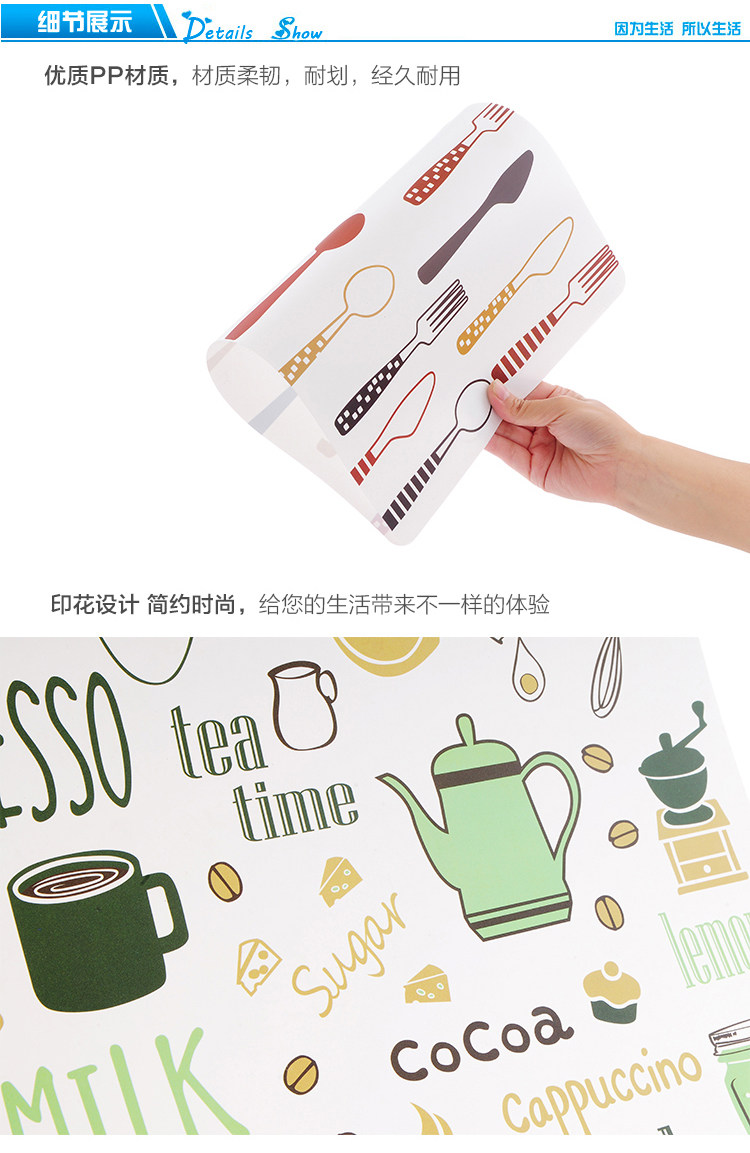 概述: PP材质,防水隔热,多样图案设计,点亮整张餐桌 为您的生活增添一份时尚。
