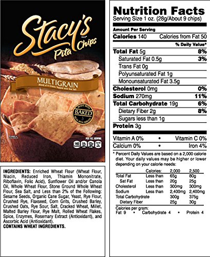 -. Feature : 18-ounce bag of Stacy?s Multigrain Pita Chips / Stone-ground wheat flour, wholesome crushed oats, and sesame seeds baked directly into every delicious chip / Baked, no artificial colors or flavors, made with all non-GMO ingredients, and no MSG / Enjoy these while entertaining guests, as a fresh snack, and alongside lunches / Try these with Sabra Hummus, straight from the bag, or your favorite dip / 18-ounce bag of Stacy's Multigrain Pita Chips / Stone-ground wheat flour, wholesome crushed oats, and sesame seeds baked directly into every delicious chip