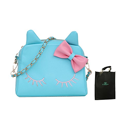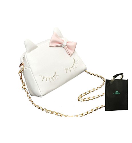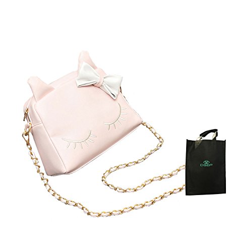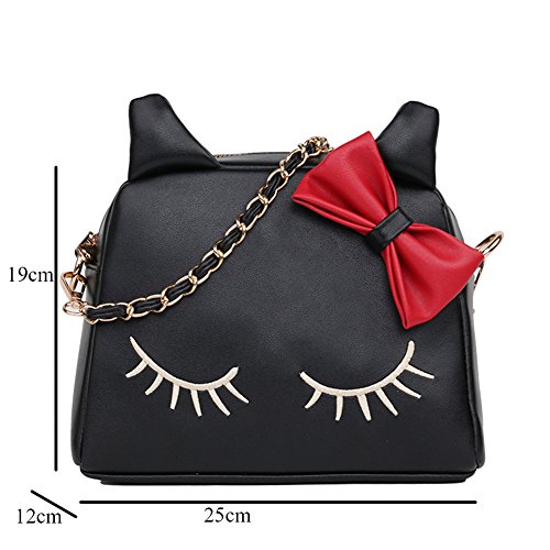 This bag is sweet and lovely,special the cute cartoon cat pattern and lovely bow-know, it was made by high quality soft pure color synthetic leather, the shoulder chain is elegant and pretty.