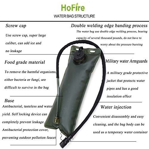 -. Feature : BPA Free & FDA Approved: Food-grade premium quality anti-bacteria materials. Manufactured with double welded leak proof sealing technology, thick EVA water bladder is pressure-tolerant and wear-proof. / High Quality Material: Strict Test The water bladder past pressure test,This heavy duty hydration bladder replacement is made using tough EVA material that is wear-proof and has a pressure tolerance of 220 lbs. The screw cap forms an ultra-tight seal to prevent any leaks whatsoever. / Dual Opening Design: Screw cap + sliding opening. Large opening design allows you to refill in any condition, easy cleaning, rinsing and drying. For cold water, ADD ICE CUBES directly from a scoop or refrigerator ice dispenser.Cycling,Hiking water storage bladder/tank,bladders for water storage, biking, climbing, hunting. / No Leak: the bag cover is designed with a sealing washer, prevent Water Leakage, irrigation port with changeable circular design, easy to open and close; removable nozzle , the edible material sealing gasket, sealing strong, no water seepage and leak / HoFire Guarantee: All HoFire products have a strict test, Please rest assured to buy our products we will guarantee 180 days unconditional refund.