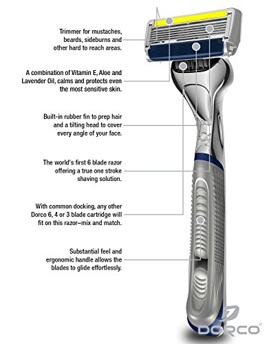 10 long-lasting Dorco Pace 6 Plus cartridges and one high-quality Dorco Pace handle with stylized rubber grip.