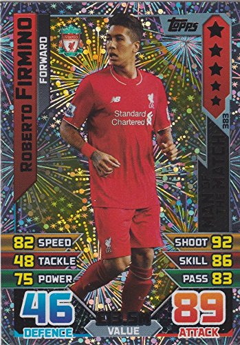 -. Binding : Toy -. Brand : Match Attax -. EAN : 0744881988865 -. Feature : Match Attax 2015/2016 / Individual Man Of The Match Trading Card / My Trading Cards sends all cards straight from the pack in mint condition and also well wrapped packaged for added protection. -. IsAdultProduct : 0 -. Label : Topps -. Manufacturer : Topps -. ProductGroup : Toy -. ProductTypeName : TOYS_AND_GAMES -. Publisher : Topps -. Studio : Topps -. Title : Match Attax 2015/2016 Roberto Firmino Man Of The Match Trading Card 15/16 -. UPC : 744881988865