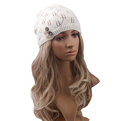 -. Title : Tinksky Women Winter Warm Knit Hat Snow Ski Caps Lace Button Leaves Hollow Out Knitting Hat (White)