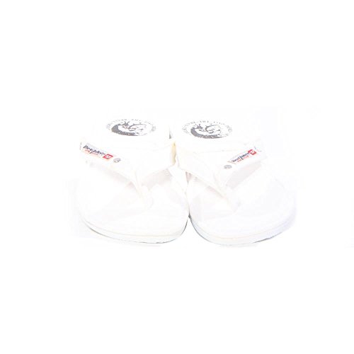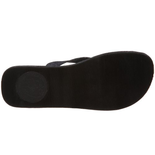Slimline flip-flop with logo patch along fabric strap and rivet detail