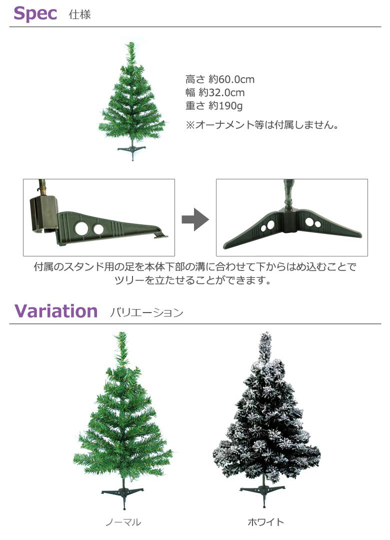 テーブルや玄関などのちょっとしたスペースに飾れる60cmツリー 枝を広げるだけでカンタンに飾ることができます。通常のツリーと雪が付いているように見えるツリーの2パターンを用意。 各枝にはワイヤーが入っているので、好きな形に曲げることができ、オーナメントを飾り付けるのが楽です。 枝の広げる量を調整することもできます。また、コンパクトに収納できるのでスタンドを取り外せば省スペースに保管も可能です。 サイズ(約):高さ60cm、幅32cm、重さ190g 付属品:スタンド部