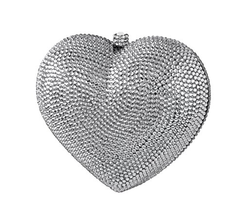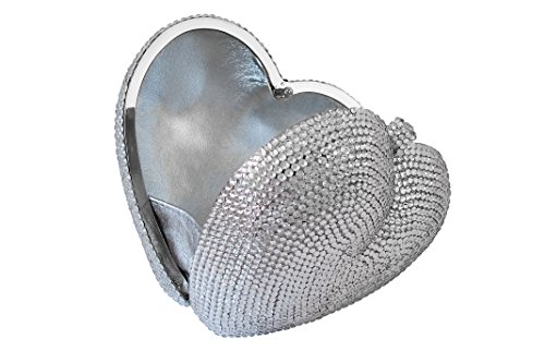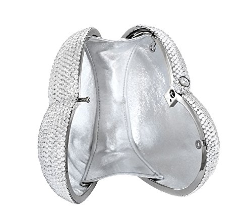 Dimensions: Approximately 13" inches in circumference. 6.5" inches wide, 5.25" inches tall (measured from outer shell). Detachable Chain Strap: Silver - 19.5" inches. Closure: Push Lock with Crystal Insets. Lining: Metallic Silver