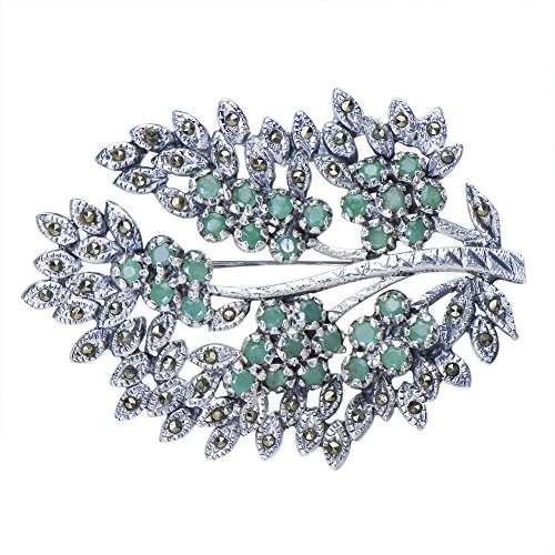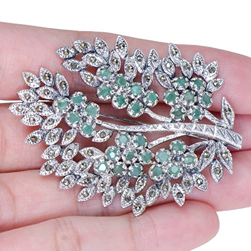 -. Title : Festive Natural Emerald Marcasite Fern Tree of Life 925 Sterling Silver Brooch