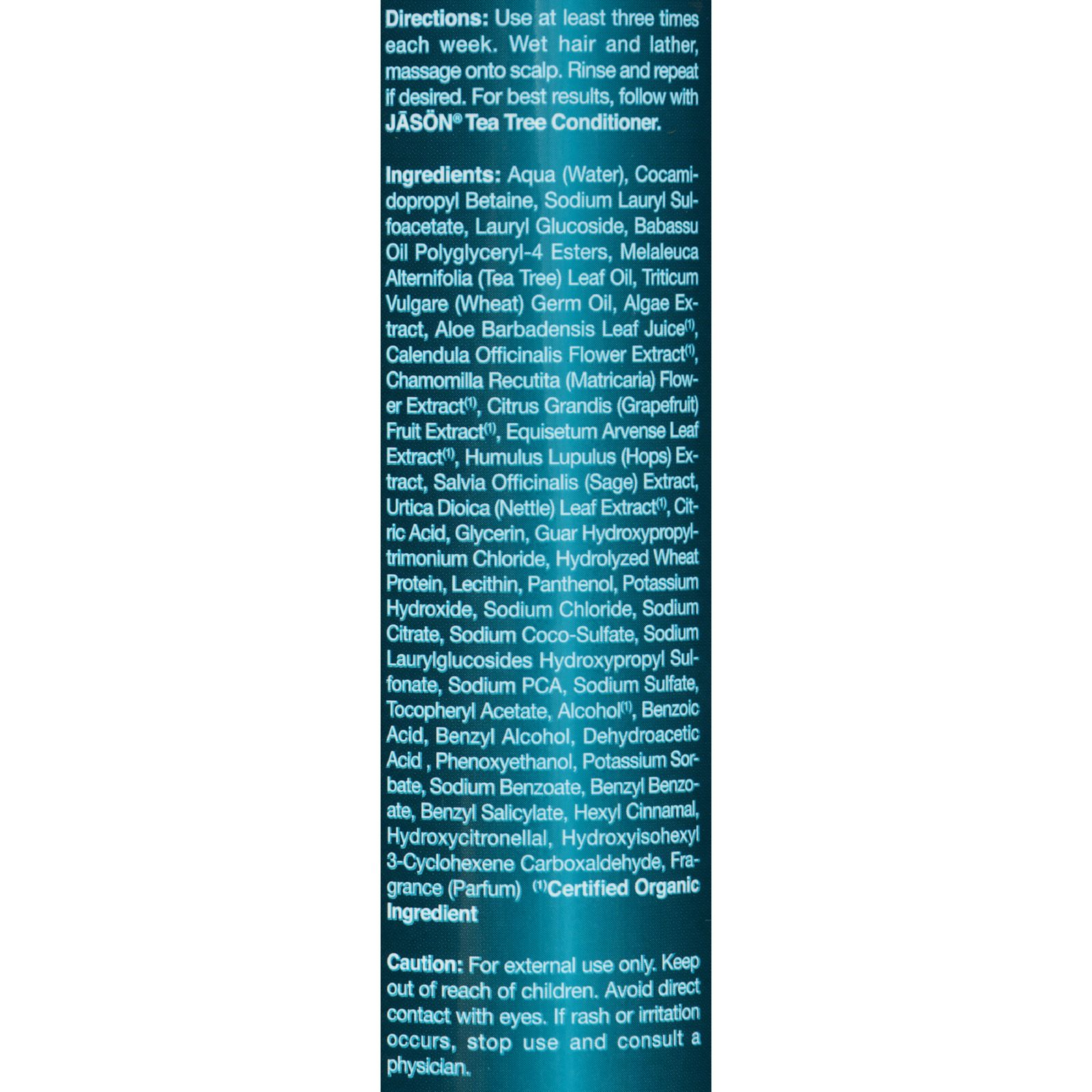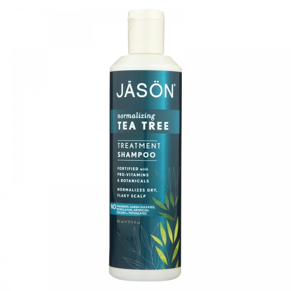 | Jason Normalizing Treatment Shampoo Tea Tree Description: Fortified with Pro-Vitamins and Botanicals Normalizes Dry, Itchy Scalp No: Parabens, SLS or Phthalates NEW LOOK Same Great Formula This normalizing shampoo gently cleanses and nourishes to minimize dry, flakey skin build-up on the scalp. Australian Tea Tree Oil, known for its anti-bacterial and anti-fungicidal properties, is combined with Grapefruit Extract and protein to purify and fortify hair follicles while soothing Calendula, Hops, Sage Extracts and Wheat Germ Oil, helps relieve discomfort of itchiness. Gentle enough to use everyday, hair is soft with added volume, luster and manageability.
