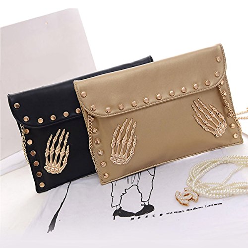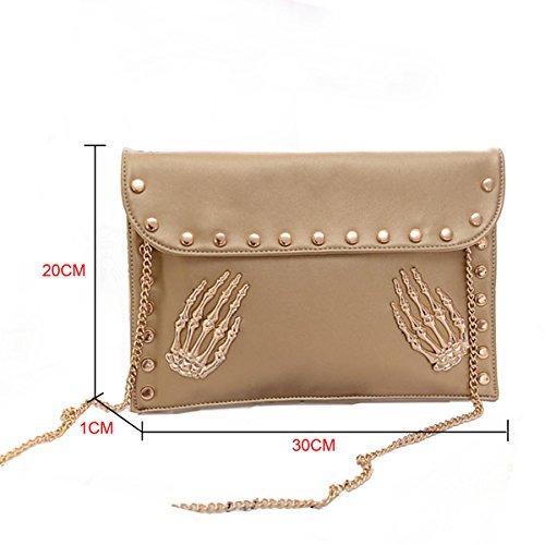 -. Feature : This chic clutch bag is made of quality Pu leather and decorated with shiny skull and rivet / The perfect bag is fashionable as well as functional,it allows you to keep all your daily essentials in one convenient and stylish place / Approx: 12" x 8.2"(W*H), Enough room to put your personal belongings in it like ID card, keys, credit card, cash, cell phone, lip gloss,etc / Front lap front with a magnetic-snap closure, detachable chains and zipper closure inside,can be used as a shoulder bag,handbag,clutch / Beautiful and stylish gifts sent to relatives, girl friends and colleagues for various events and everyday use