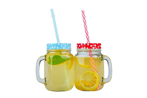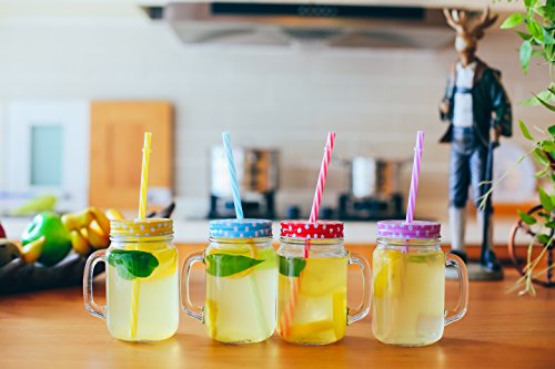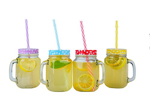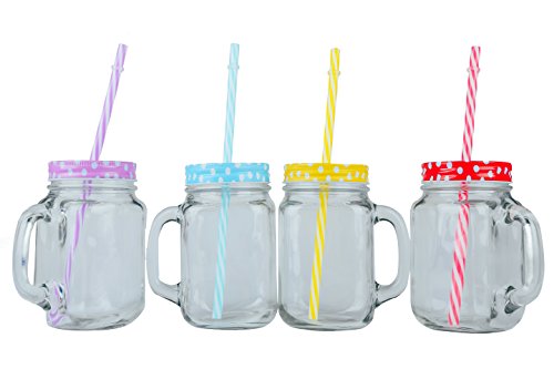 JingleBells 16oz/450ml Glass Mason(with Handle) Jar Drinking Bottle Juice Jar with Metal Lid& Plastic Straw ,Set of 4 Color