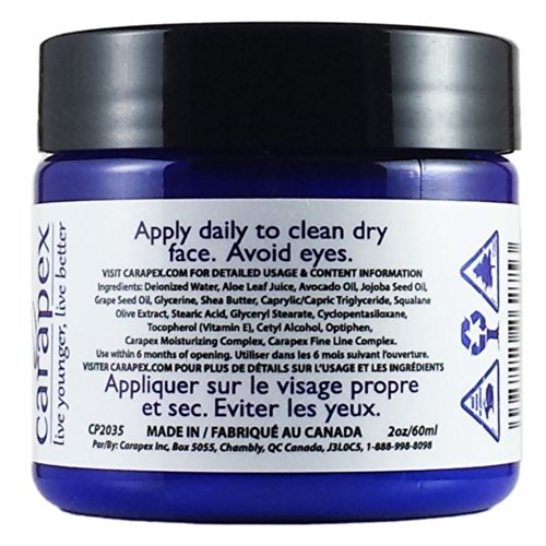-. Feature : Rich, nourishing cream targets the signs of aging, gently smooths wrinkles, lines without greasy after feel / Softens, moisturizes and rejuvenates your skin in one step; delivers younger, healthier look and natural glow on your face / Allows you to enjoy the full benefits of natural shea butter, aloe vera, avocado oil, jojoba oil, olive oil, and vitamin E / Visibly lessens the appearance of fine lines and wrinkles with our exclusive Carapex Moisturizing Complex and Carapex Fine Line Complex / Made in Canada with natural elements, paraben-free, fragrance-free, harsh chemicals-free, cruelty-free