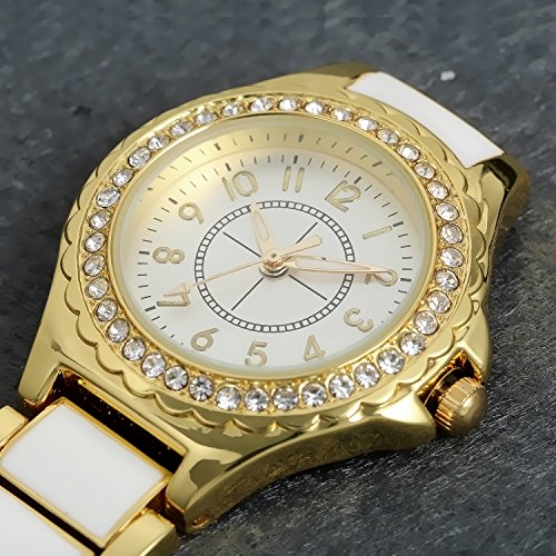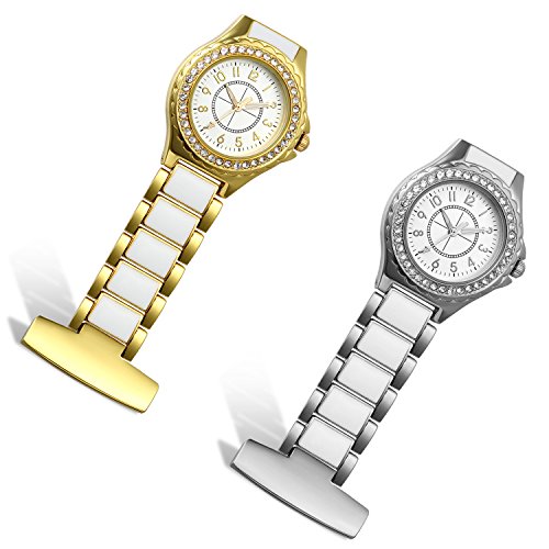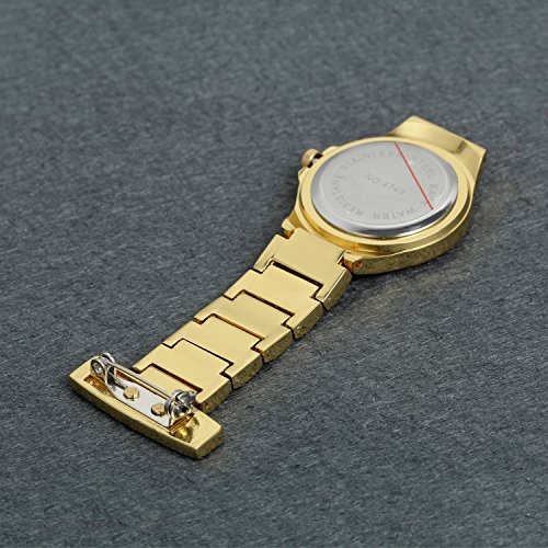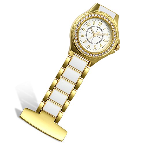 -. Feature : 100% Brand new watch, come with gift bag P.R.Inted Lancardo, Engraving service please contact me. / Package contains 1 piece ladies professional nurse pocket fob watch with gold tone case, bling sparkle Rhinestone crystal bezel. / Length:2.4"(6.0cm), Case Diameter:1.1"(2.9cm), Thickness:0.3"(0.8cm) / Gold plated stainless steel Three-link bracelet band, with white Epoxy middle link, big easy read arabic numerals markers. / Living water resistant design (Not suitable for swimming, diving, shower, etc.)