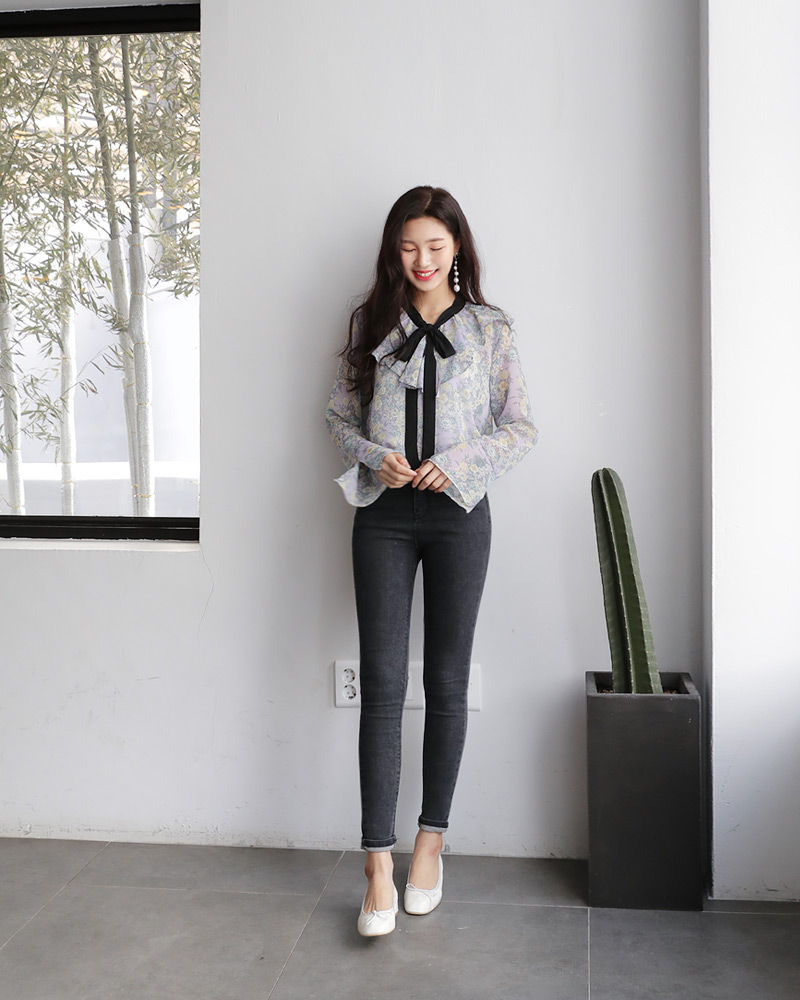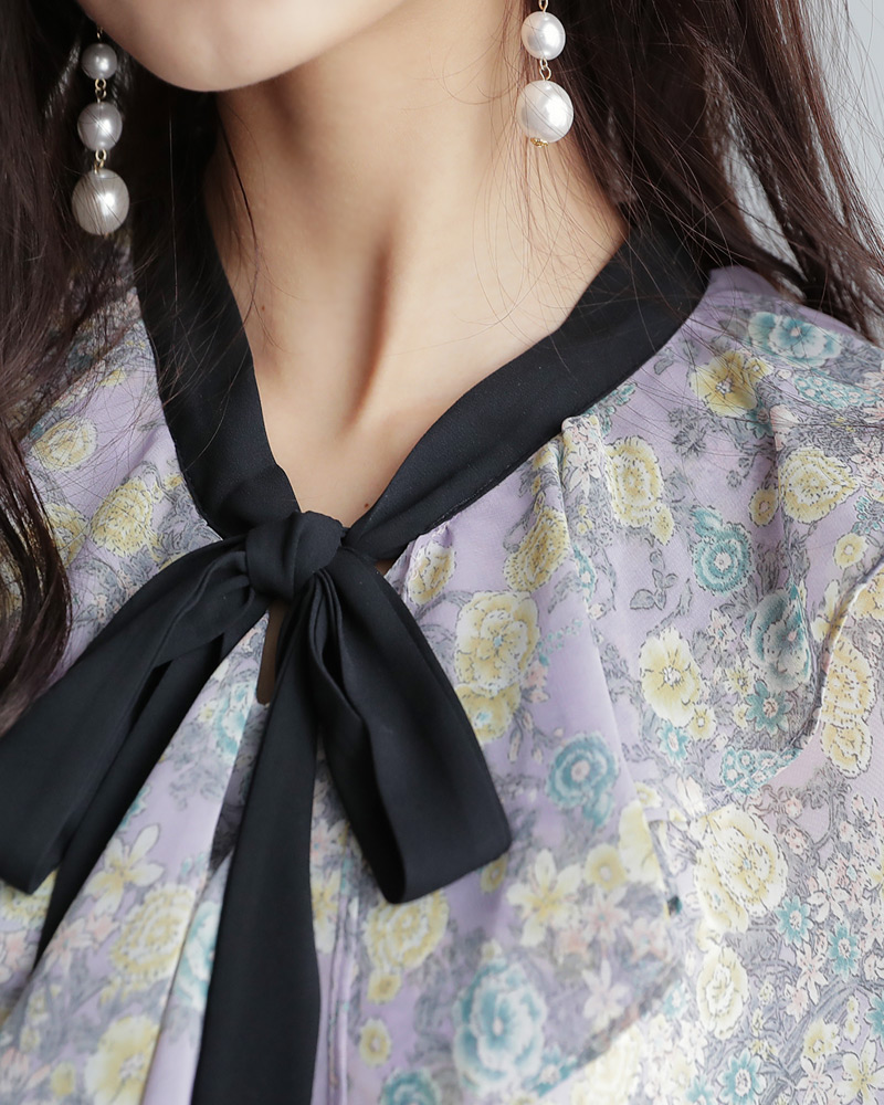 - Vネックラインに配色ラインのタイでラブリーさをプレゼントいたします
