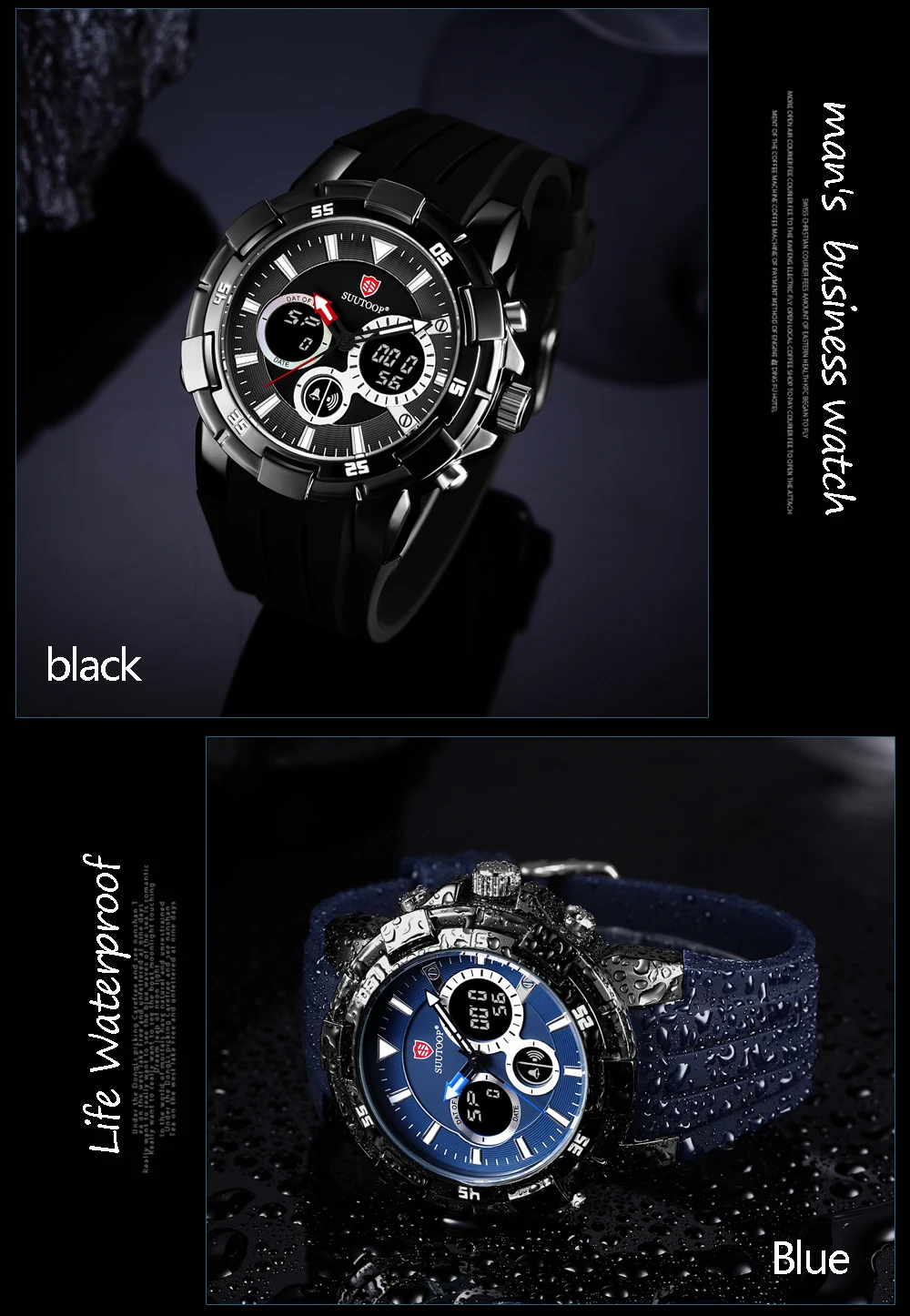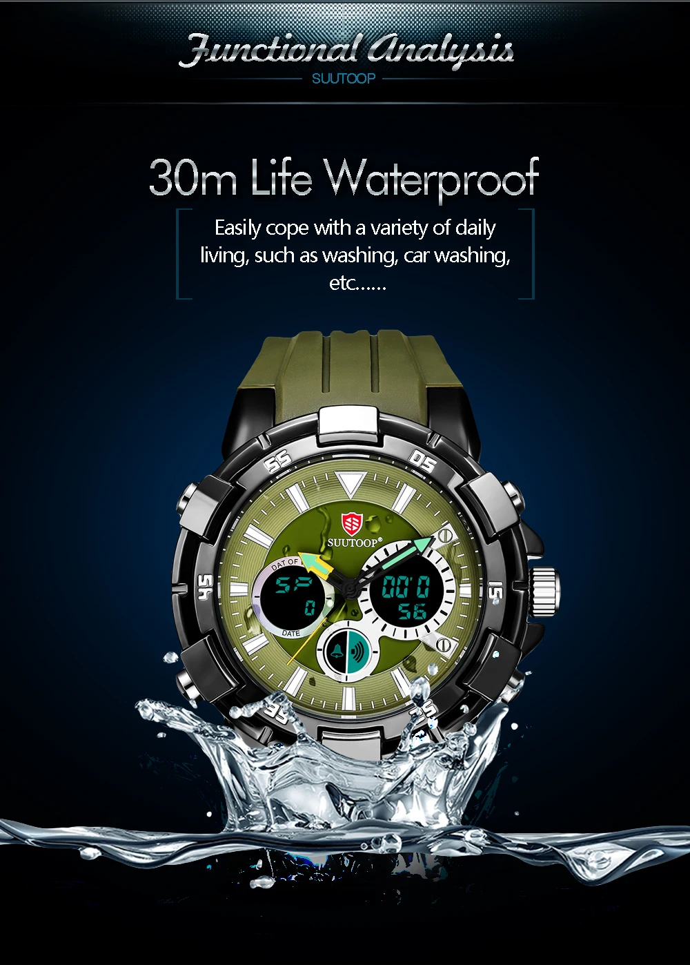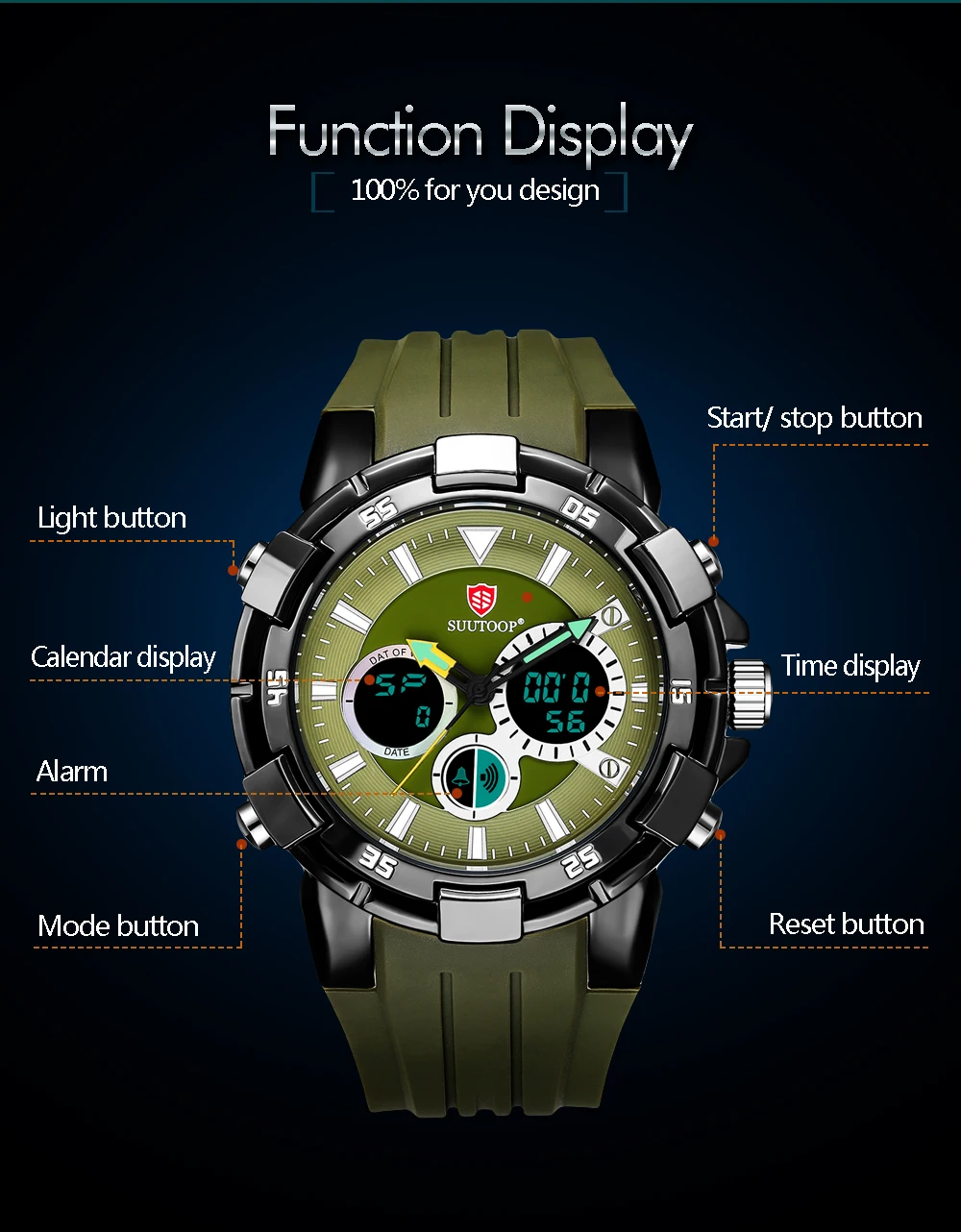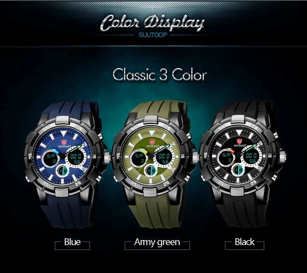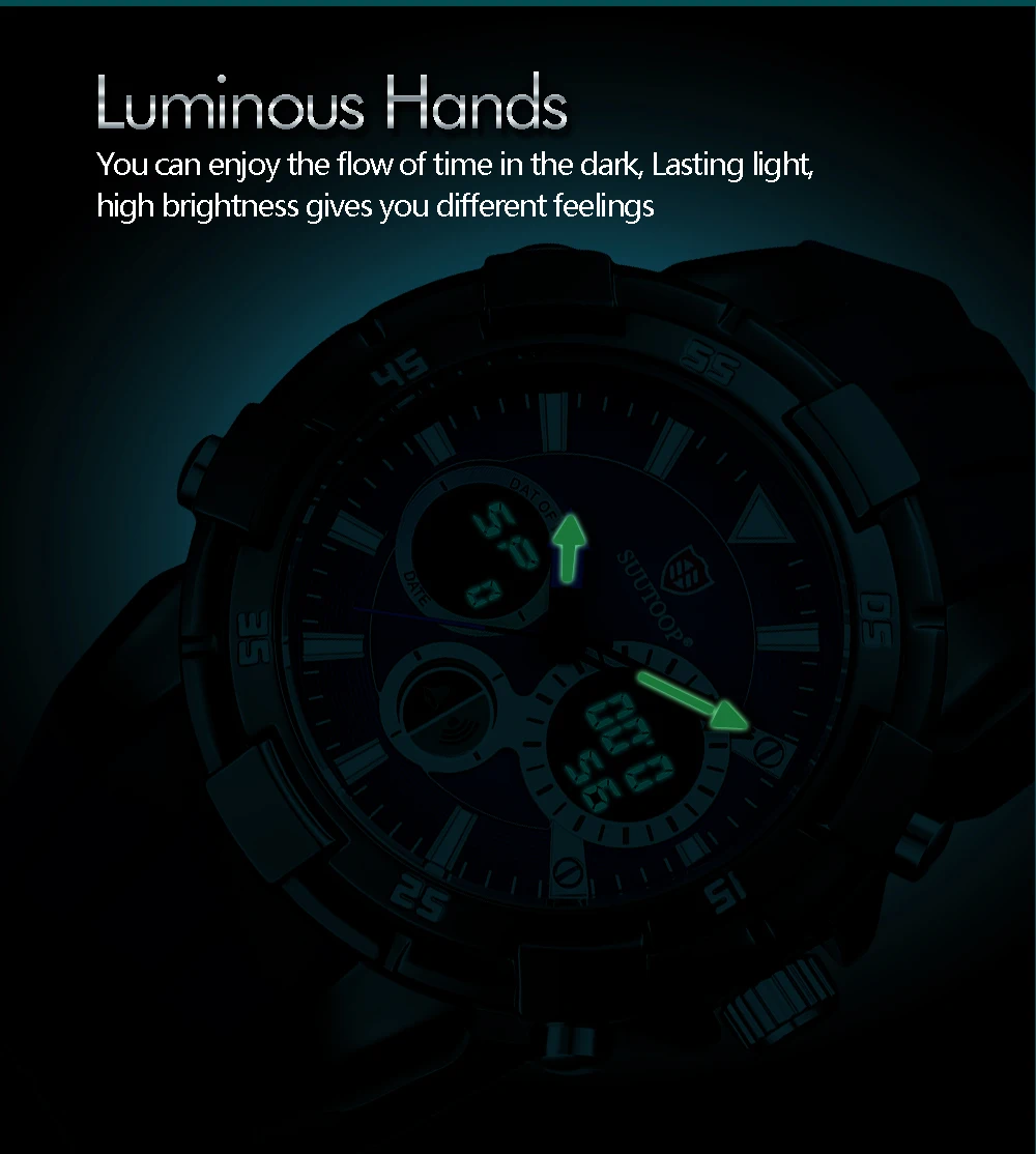 Feature:Complete Calendar,Shock Resistant,Week Display,Water Resistant,Stop Watch,Back Light,LED display,Alarm