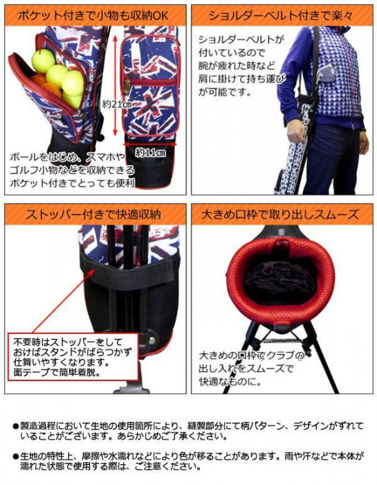クラブを4~5本収納可能なので、セルフプレー時のクラブの持ち運びが楽になります。クラブ忘れも防止します。握りやすい大型グリップ、収納しやすいフロントポケット、グローブホルダーなど、ミニバッグとしての機能も充実!!練習場などでの使用にもおすすめです。 |