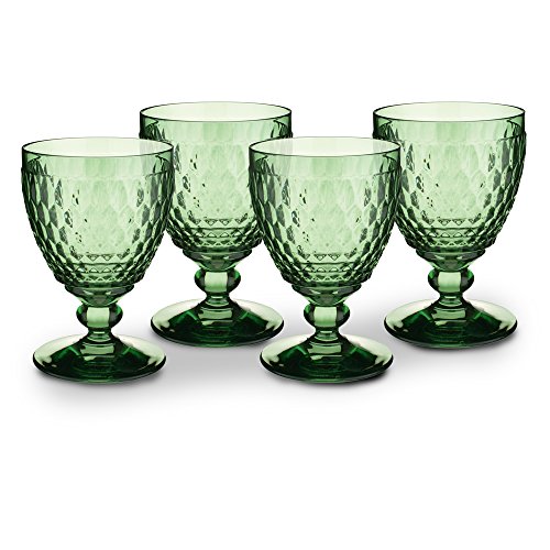 Amazon.com Jazz up a simple place setting or create a glowing emerald decor with this set of four crystal goblets in Villeroy Boch's Boston Green pattern. Retro in style but thoroughly modern in appeal, each glass exudes character: The large oval bowl has a highly textured hobnail finish that's fun to hold. Using geometric forms, the architectural stem reflects beautifully in both indoor candlelight or afternoon sunlight at a picnic. Below, a wide, even base balances the smooth upper rim and holds the piece in deep green balance. At just 5-1/2 inches tall, these compact goblets feel pleasantly sturdy and substantial. Crafted of 24 percent full lead crystal in Germany, the set will maintain its sparkle and timeless quality for years to come. It also goes safely into the dishwasher--perfect for a contemporary lifestyle. --Kara Karll 0