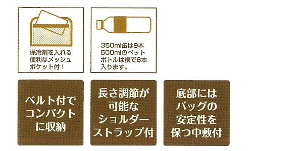 350mL缶は9本、500mLのペットボトルは横で6本入ります。ベルト付でコンパクトに収納可能。底部に入っている中敷がバッグの安定性を保ちます。 |