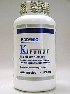 BodyBio's Omega 3 Fish Oil has been developed to provide the brain with specific nutrients it needs to function properly. Each capsule of Kirunal contains 500 mg. of specially selected fish oil that provides three times more EPA (eicosapentaenoic acid) than DHA (docahexaenoic acid). What it does not contain is mercury, dioxides, or PCB.
