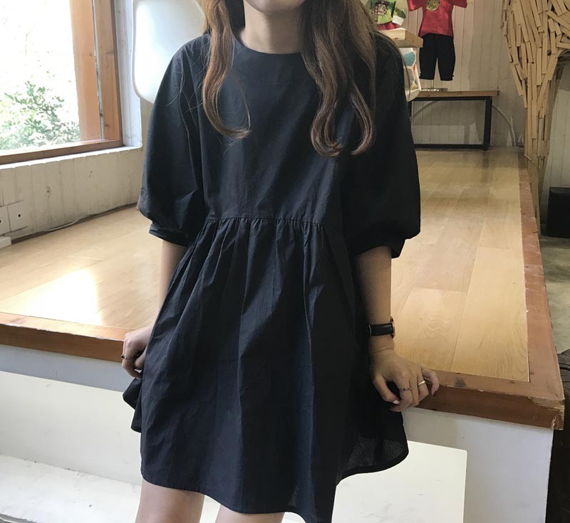 ラウンドネックで五分袖パフスリープのハイウエスト切り替えワンピース♪