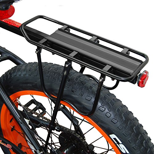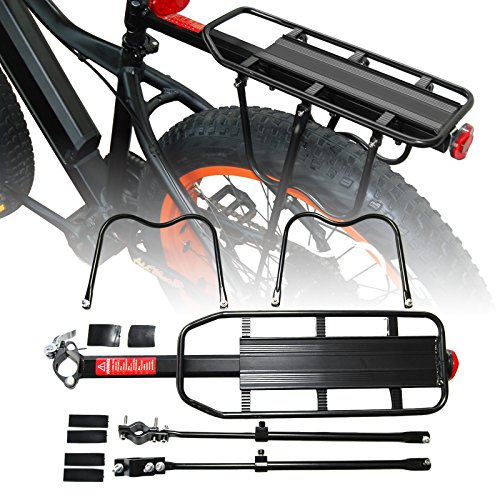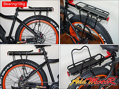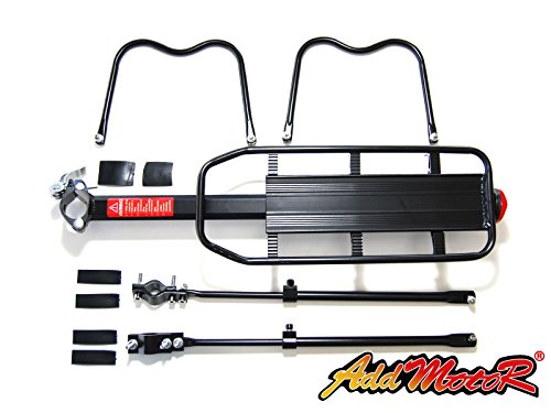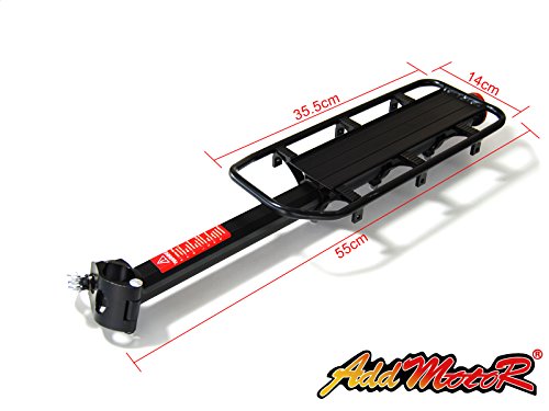 Product Parameters Material: Sturdy lightweight Aluminum Alloy Color: Black Load weight: Carries up to 55 lb (25kg) Rack Weight: 2.73lbs / 1240g Dimensions: Rack Length: 35.5CM Rack Width: 14.5CM Middle of the main rod: 55CM Package Included: 1 X Rear Bike Rack Addmotor carrier rack is for carry the cargo, not available to carry a man. And it fits almost any adult-sized bicycle such as road, mountain, hybrid, fat bikes, and so on. Go especially well with Addmotor M-550, M-150, H1 e bikes, but not for M-850, H2,H5,XIMA X1. It's very strong, durable, versatile,good design, adjustable and heavy duty rear bike rack. Installation is pretty intuitive, just look at the pic on amozone and you will be fine. Note:Please check bicycle to ensure that it has mounting holes on the rear dropout and seat stays.