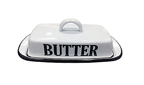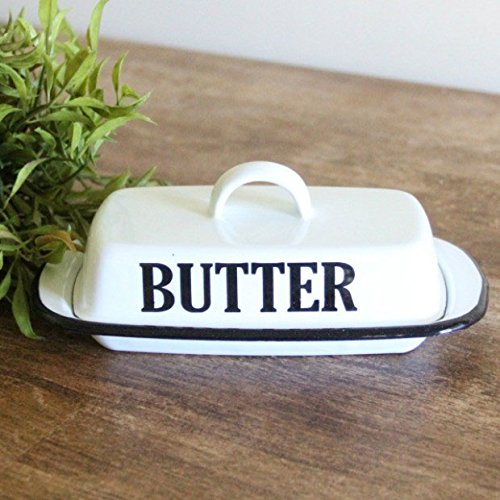 Studio : VIP Publisher : VIP Product Description Go back to the basics with this farm-fresh crisp, white enamel butter dish. Adds a little vintage style to your kitchen, picnic table, backyard BBQ, or potluck suppers! Features a black rim, lightly distressed finish and bold black lettering. Measures 7.75" wide x 3.5" high x 4.25" deep. This classic-looking piece is a great way to update your farmhouse kitchen! 0