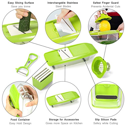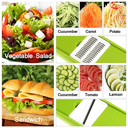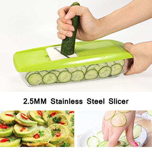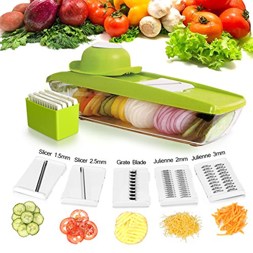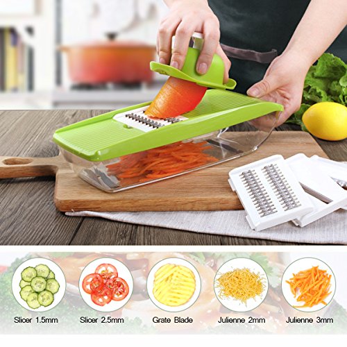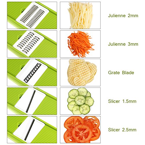 - ▲5 Multipurpose Grater: 5 different kind of interchangeable stainless steel blades, it can create 5 types of vegetable slices/julienne ( 2.5m slicer, 1.5mmslicer, 2.0mm&3.0mm Julienne, one grate blade). This one is easy to use and will cut your prep time in half, by cutting through potatoes, onions, carrot and vegetables with ease.