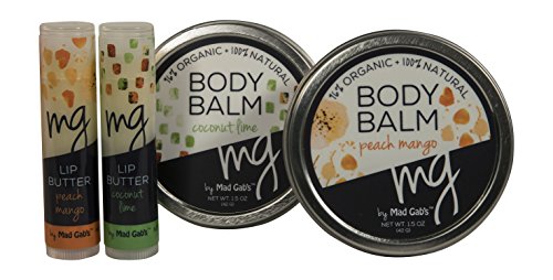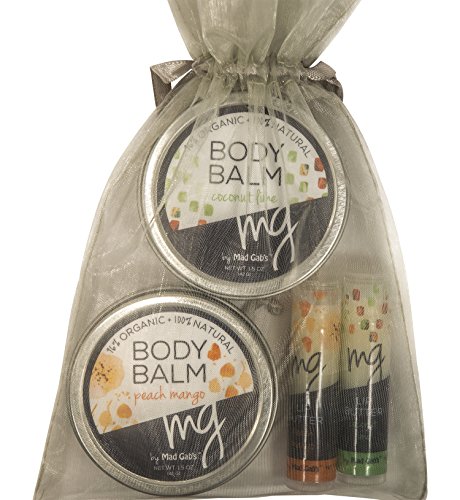 - Gift Set includes: 1 Coconut/Lime body balm, 1 Mango/Peach body balm, 1 MG Coconut/Lime lip butter stick and 1 Mango/Peach lip butter stick in organza bag