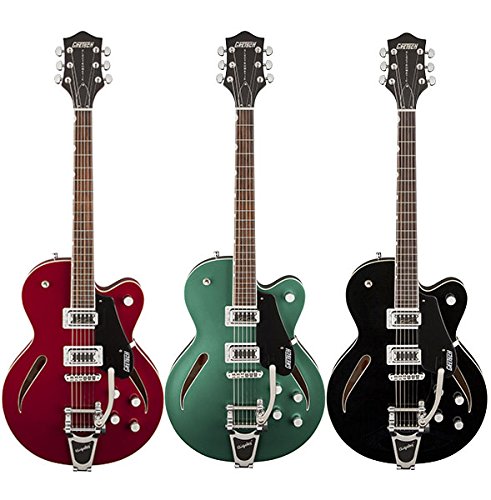 G5620T-CB는,16인치폭의 5프라 꿈 이 Pull 몸에《스푸루스》의 센터 블럭을 이용한 싱글 cutter 웨이의 모델입니다.연주성의 높은,1.75인치(44.45mm)후의 몸에《스푸루스센타부롯쿠》를 편성하는 것에,불필요한 피드백을 일으켜 어려운 설계가 되고 있습니다.또한특징적인 캣츠아이 사운드 홀을 채용 하고 있습니다. rosewood 손가락 보드에는 클래식 섬 네일 포지션 마커 inlaid가 들어감,넥은 메이 Pull재의세트넥 조인트입니다.프론트에는 듀얼 코일의 슈퍼 하이로 트론 픽업을,리어에게는 블랙 톱 필터 트론을 탑재하고, 마스터《보류무》,2《보류무》,2톤의 레이아웃이 되고 있습니다.또한《비구스비》B70《비부라토테이루피스》을 탑재 하고 있습니다. Black,Rosa Red,Georgia Green의 3컬러를 라인업 하고 있습니다. Body Material5-Ply Maple Body ShapeSingle Cutaway Thinline BracingSpruce Center-Block F Holes Sound Holes''Cats-Eye'' Sound-Holes Body Depth1.75'' (44.45 mm) Body Width Lower Bout16'' (40.64 cm) Neck ShapeModern Gretsch Number of Frets22 Fret SizeMedium Jumbo Position InlaysNeo-Classic ''Thumbnail'' Fingerboard Radius12.5''(320 mm) FretboardRosewood Neck MaterialMaple Nut Width1.6875'' (43 mm) Scale Length24.6'' (625mm) Bridge PickupBlack Top Filter''Tron Neck PickupDual-Coil SUPER HiLo''Tron Pickup Switching3-Position Toggle: Position 1. Bridge Pickup,Position 2. Bridge and Neck Pickups,Position 3. Neck Pickup Controls2Volume,2Tone,Master Volume Hardware FinishChrome-Plated BridgeAnchored Adjusto-Matic Bigsby-Licensed B70 Vibrato Tailpiece Tuning MachinesGrover Die-Cast String NutSynthetic Bone PickguardBlack Plexi Pickguard with White ''Gretsch'' Logo Control KnobsG-Arrow Strings.011-.049 Gauges Unique FeaturesSpruce CENTER-BLOCK,White Pearloid Neo-Classic ''Thumbnail'' Position Inlays,Bound Body Top and Back,Bound ''Cats-Eye'' Sound Holes and Fingerboard,Grover Tuners,Knurled Strap Retainer Knobs,Adjustable Truss Rod with 2-Ply B/W Cover,Black Plexi Pickguard with White ''Gretsch'' Logo and Black Painted Headstock with Pearloid Gretsch Logo