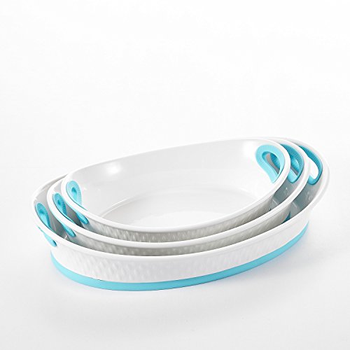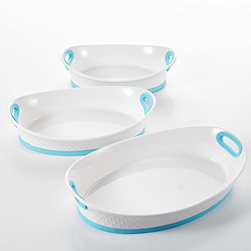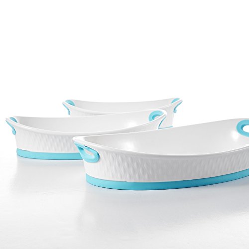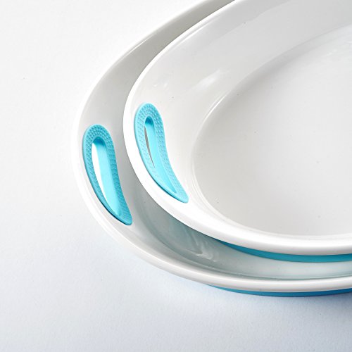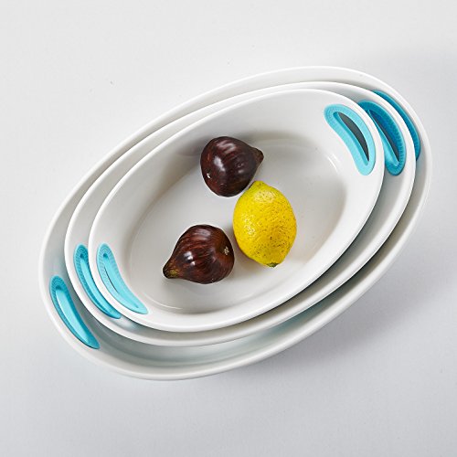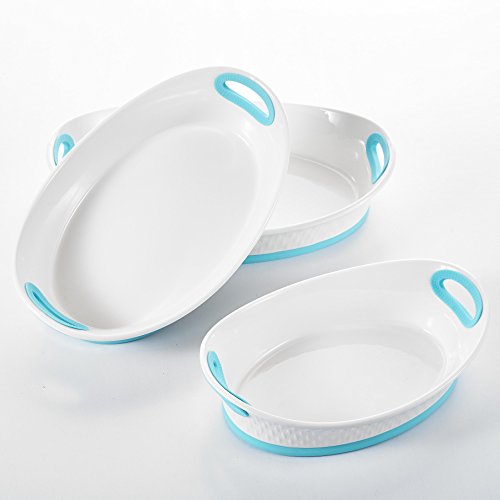 Malacasa, Series Bake, 3-Piece 12" & 13.5" & 15.5" Porcelain Bakeware Pans Ivory White Serving Trays Dishes Ceramic Baking Plates Set with Blue Silicone Handle