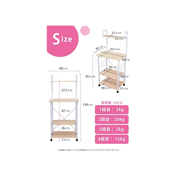 【사이즈】본체:폭60cm×(길이)깊이45cm×높이139cm / 각 천판 두께:1.6cm ◆재질:particle 보드,melamine 도장,스틸 ◆본체 중량:본체:약13kg 총중량:약14kg(포장재등 포함한다) ◆내하중:붕판(위로부터)1 단눈(째): 5kg/2 단눈(째):20kg/3 단눈(째): 5kg/4 단눈(째):15kg