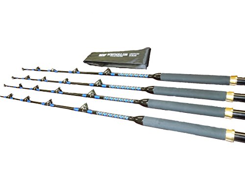 4 Pack 30-50 lb. saltwater roller rods. Four rods 30-50 lb. all roller guides. 5'6" long for IGFA stand up fishing!! Royal blue and black with gold trim. Perfect for offshore trolling and fishing for Dolphin, Wahoo, and Tuna. Featuring a classic design with use of CNC machined aircraft grade alloys for strength. Composite fiber main shaft for superior sensitivity. Super smooth rollers and durable hardware that keeps it looking good. Roller rods are perfect for deep bottom fishing for Grouper. Sensitive tip to feel the bite and a real "BULL DOG" backbone for the fight of your life! EVA foam grip won't twist like a slick handle. Fast and easy removal. Meets or exceeds all IGFA standards for all big game competitions. Eat My Tackle rod cover included! One piece heavy action. Premium grade fiberglass blank. Anodized aluminum reel seat. Cross cut aluminum gimbal butt. All rods feature 4 roller guides with a roller tip. These are black blanks with royal blue and gold trim. All rods individually wrapped in protective sock with our custom Eat My Tackle label. Retail: $1140.00
