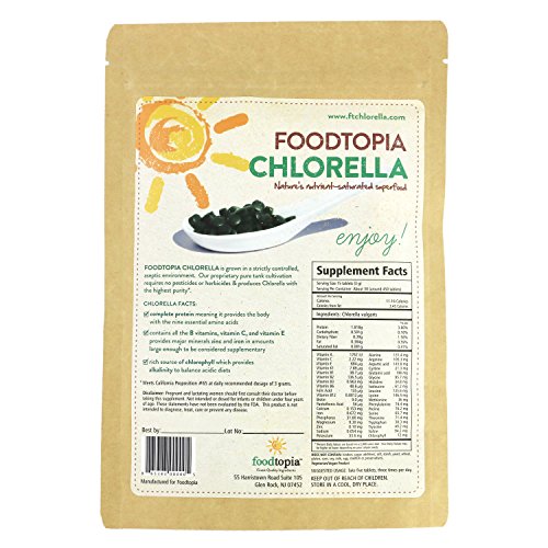 -. Feature : CLEANEST CHLORELLA. Foodtopia Chlorella vulgaris is grown in a strictly controlled, aseptic environment. Indoor manufacturing for no contamination and maximum yield. Market leader for low heavy metal content. / NUTRIENT DENSE. Supplies high levels of Chlorophyll, Beta-Carotene, Vitamin B-12, Iron, RNA, DNA and Protein. Attain higher energy and boost immune system. / HIGHEST DIGESTIBILITY. Thinner cell wall which breaks naturally during drying and packaging to allow for a digestibility of 85-95%. Typically not seen in other brands of Chlorella. / 100% PURE. 100% Vegan with no fillers, binders, coatings, additives, flow agents or preservatives. Soy free, gluten-free and GMO-free. / 450 TABLETS. Easy to swallow or chew. Also will crush easily in blenders; incorporate it in your next power-smoothie!