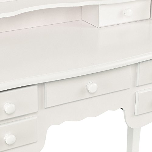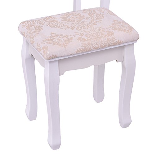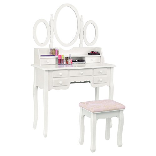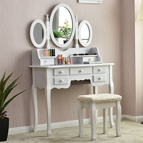 Feature: Classic white appearance Made of wood and MDF, sturdy and durable Tri-folding mirror: Two 180°folding mirror and a center mirror help you view your face or hair from multiple angles Smooth and spacious table top Equip with 4 drawers to store your beauty supplies With a matched cushioned stool Curved legs add elegance to the dressing table set Lots of space for your earrings, necklace, bracelets, glasses, watches, perfume and all your accessories A good decoration of your home Assembly required