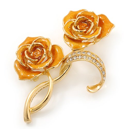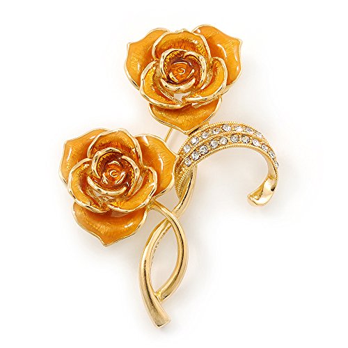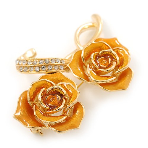 -. Title : Gold Yellow Enamel, Crystal Double Rose Brooch In Gold Plating - 65mm Length
