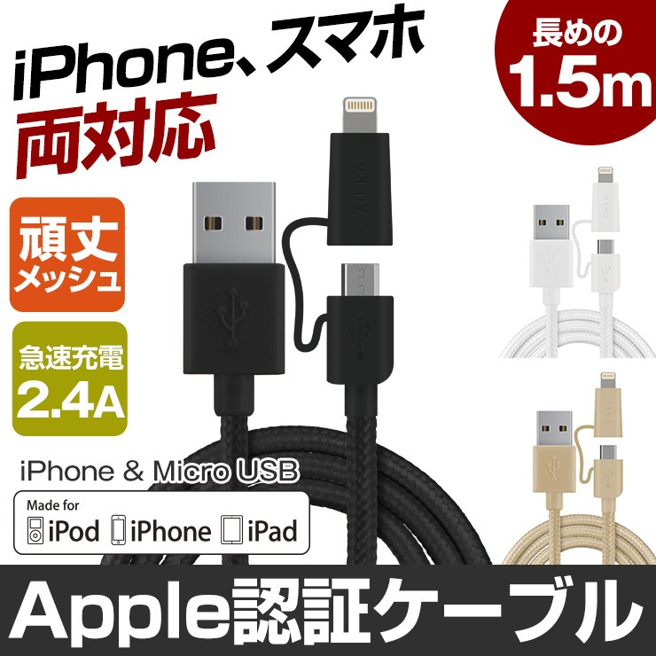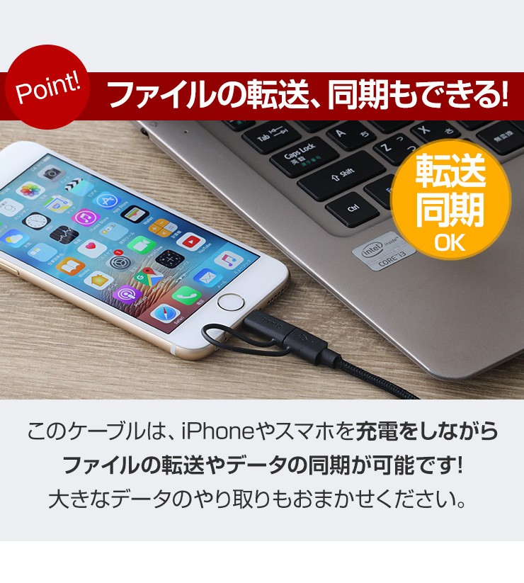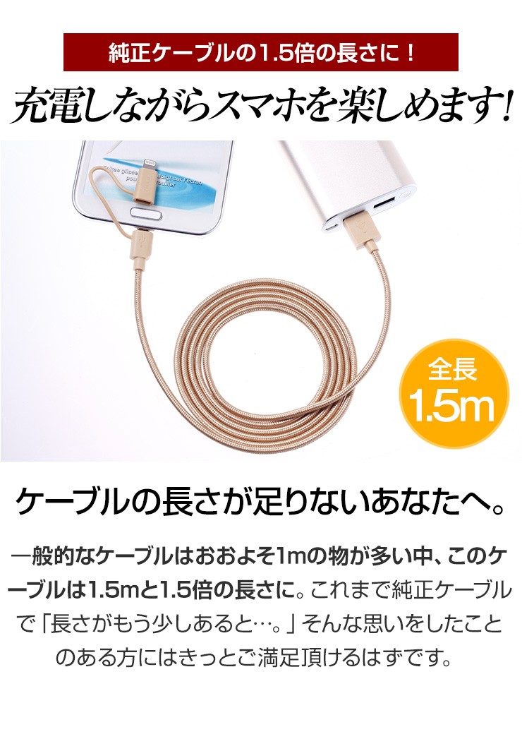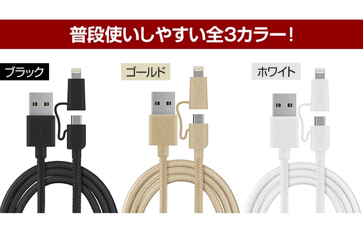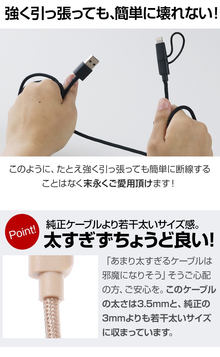 長さ 1.5m重さ 36gコネクタ USB、iPhone用コネクタ(8-PIN)& Micro USB対応電流 5V/2.4A Max転送速度 480 Mbps保証期間 お買上げより180日※故意に強い力を加えると破損する可能性がございますので、ご利用の際はご注意ください。デジキン