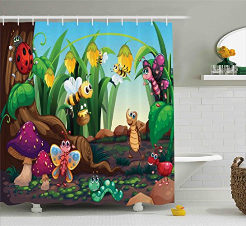Animal Decor Shower Curtain by Ambesonne, Ladybug Butterfly Bee in Exotic Garden Botany Cute Kids Nursery Themed Cartoon Art, Fabric Bathroom Decor Set with Hooks, 70 Inches, Multi