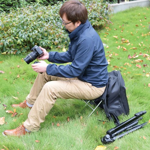 -. Feature : リュック:幅290×高さ460×奥行210(mm)※ハンドル含まず / 折り畳みイス:幅240×高さ300×奥行260(mm) / 重量:バック:1300g(イス含まず) / 重量:イス:300g / イス耐荷重:約100kg / ※勢いよく座ったり、負荷をかけるような座り方はおやめ下さい。 / 内容量目安:カメラ本体×3、ズームレンズ×3(カメラ・レンズのサイズによって異なります。) / 内容品:本体、日本語取扱い説明書 / 保証期間:6ヶ月