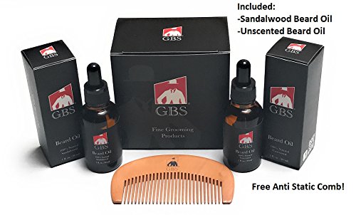 Premium Beard Oil Gift Set- Unscented & Sandalwood Oil with Free Anti-Static Wood Comb!